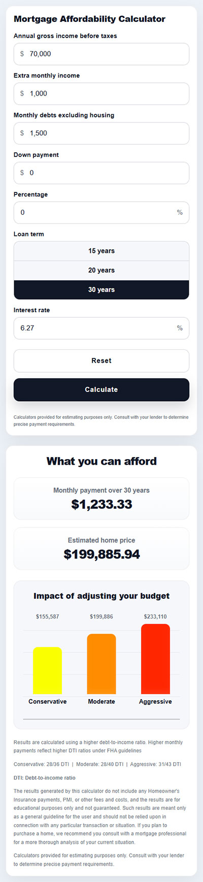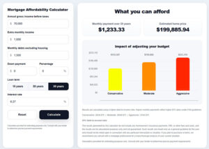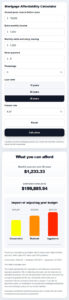 The Mortgage Affordability Calculator was designed with a modern presentation in mind. It includes a two-panel layout, easy-to-read inputs, segmented loan term buttons, strong visual hierarchy, and a chart that helps explain affordability ranges in a simple way. The result is a buyer-facing widget that looks polished and feels premium.