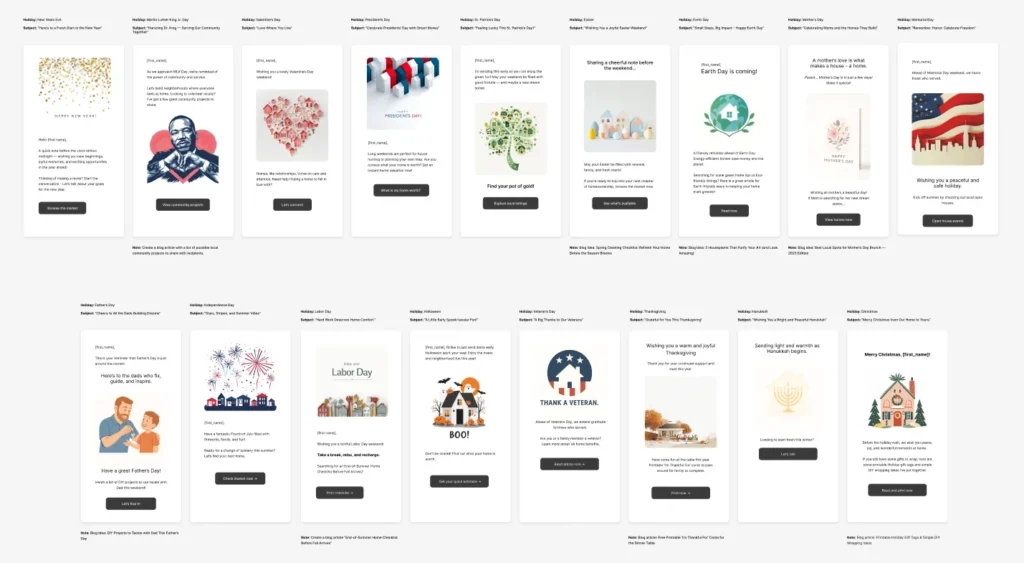 Each message combines friendly seasonal greetings with subtle, conversion-focused real estate CTAs that grow your brand while building relationships — whether it’s “Love Where You Live” for Valentine’s Day or “Stars, Stripes, and Summer Vibes” for Independence Day.